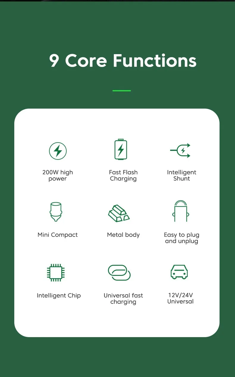 200W Car Mobile Phones Fast Charger Dual USB Quick Charger 3.0 USB Type C 12-24V Lighter Fast Charging Car Power Charger Adapter